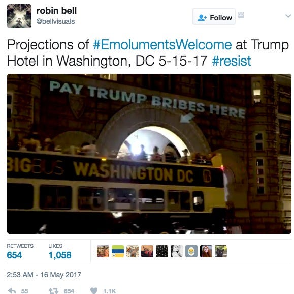 An artist and filmmaker projected the words “Pay Trump bribes here” on the front of the Trump International Hotel in Washington Monday evening.