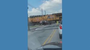 WATCH: Passengers escape from SUV before train smashes into it Three people barely escaped from an SUV after it got stuck on railroad tracks near Dallas. Authorities said no...