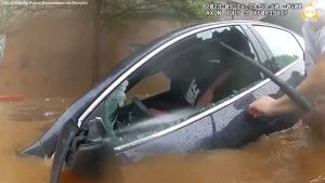 WATCH: Police smash car window to save driver trapped in floods Police officers use a baton to smash through a car window and rescue a driver trapped in floodwaters in...