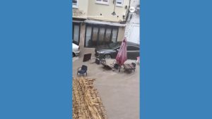 WATCH: Furniture washed away as floods hit Spain Strong floodwater gushed down a street in Spain, carrying away outdoor furniture.