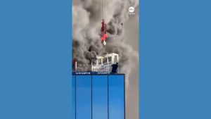 WATCH: Worker rescued from roof of burning building Dramatic eyewitness video shows a worker being lifted to safety by a crane after being trapped on the roof...