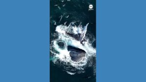 WATCH: Whales feast on fish Stunning drone footage shows two whales rising from the water to feast on a bait ball of small fish.